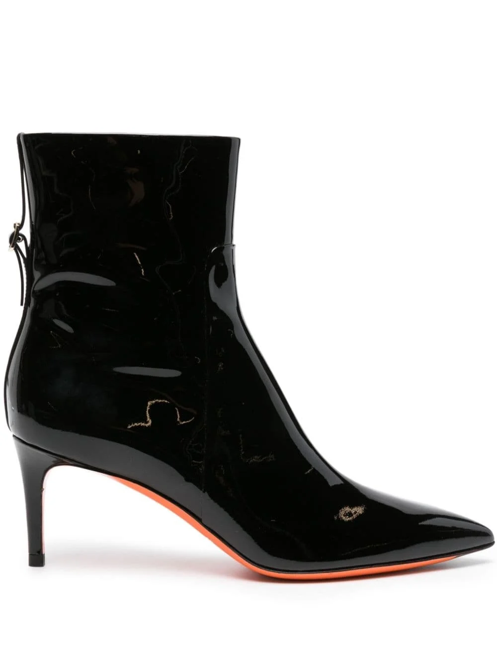 65mm patent leather ankle boots Displaying a slim design, these Santoni ankle boots are sharp from heel to toe. A pointed toe compliments the 65mm stiletto heel, all presented in a black patent style. Highlights - Black - Calf leather - Patent finish - Pointed toe - Side zip fastening - Rear buckle fastening - Branded leather insole - 65mm stiletto heel - Ankle-length - Gold-tone hardware - This piece comes complete with a protective dust bag. Made in Italy Composition Lining: Calf Leather 100% Sole: Rubber 60%, Calf Leather 40% Outer: Patent Calf Leather 100%
