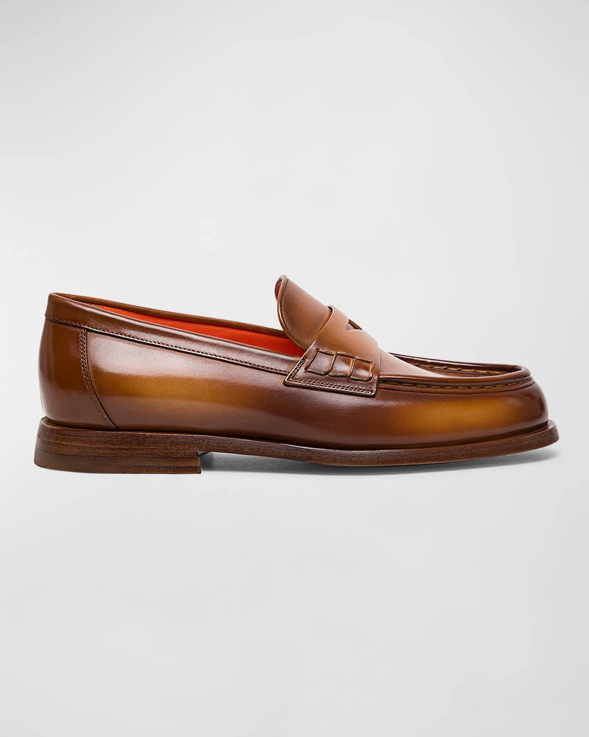 - Santoni "Airglow" classic, hand burnished leather penny loafers - Flat heel - Round moc toe - Notched vamp with keeper strap - Slip-on style - Leather outsole - Lining: Leather - Made in Italy