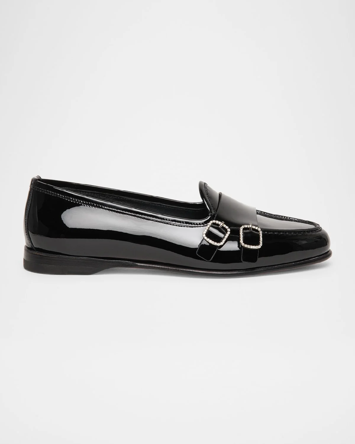 - Santoni "Andrea" in patent leather with crystal double buckles - 0.50 in / 15 mm flat heel - Tapered round toe - Apron stitching - Slip-on style - Leather outsole - Lining: Leather - Spot clean - Made in Italy