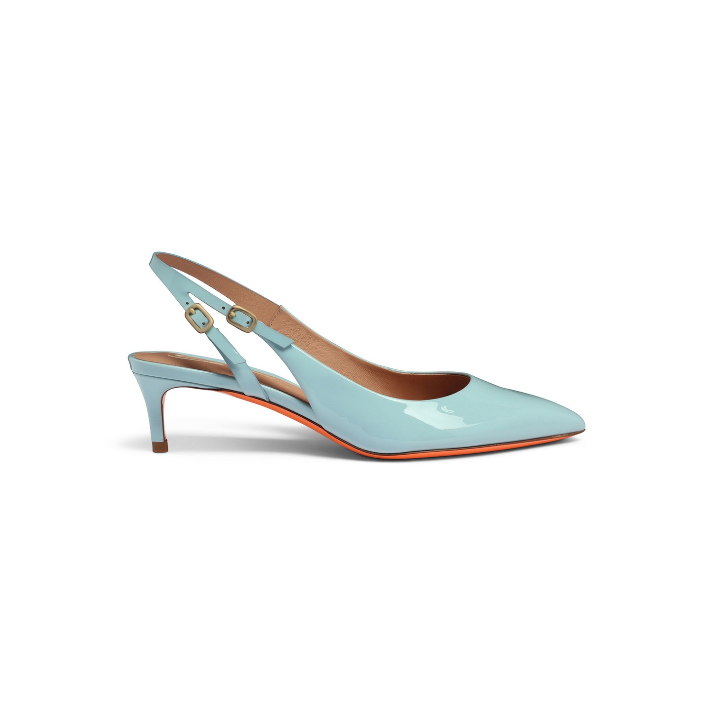 A harmonious fusion of Santoni’s heritage codes, this slingback is the definition of exclusive elegance. Crafted from patent leather, its sleek silhouette features a tapered toe and a strap on the back inspired by the iconic lines of our signature double buckle. Styled with a comfortable mid-height heel that works effortlessly with both casual and evening looks alike. Product details Product ID: WDLQ71407HA2NVHDZ22 - Crafted from patent leather - Color: sky blue - Classic silhouette with tapered toe - Double buckle-inspired strap closure - Leather sole - 4.5 cm high heel - Printed Santoni logo on the insole - Made in Le Marche, Italy