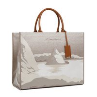 Like a precious souvenir, a postcard from the most charming places in Le Marche, this shopper is a homage to Santoni's homeland, and to its artistic and artisanal heritage. Its fabric construction is embellished with an entirely hand-embroidered design depicting the stunning cliffs of Portonovo. Elevated with leather details, a mini mirror charm and a handy inside zip pocket. Product details Product ID: DIBBA2457BAH2RME15 - Shopper - Crafted from hand-embroidered fabric - Souvenir intarsia design - Colour: white and beige - Tan leather handles and details - Detachable charm with mirror - Inside zip pocket - Tonal embroidered Santoni logo - Dimensions: 44 cm x 35 cm x 17 cm - Made in Italy