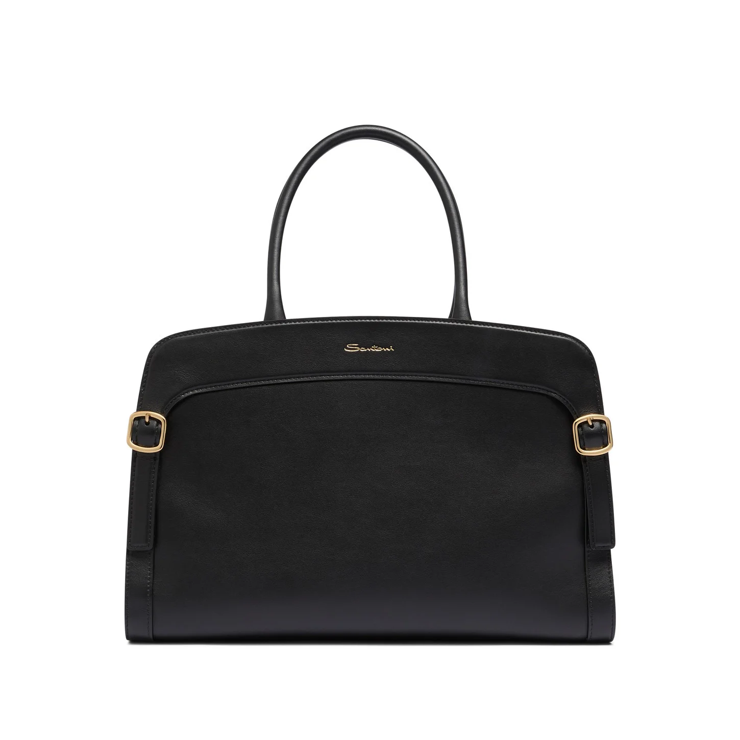 Rich in heritage allure yet undeniably modern, this top-handle bag is a refined companion that pairs effortlessly with any outfit. Its compact yet spacious design continues the stylistic evolution of one of Santoni’s signature style codes: our double buckle. Crafted from leather with padded handles for maximum comfort, it features a host of inside pockets and a detachable shoulder strap, transforming seamlessly to shoulder bag or crossbody to suit your mood. Product details Product ID: DFBBA2779DBHFRYN01 - Crafted from leather - Color: black - Double-buckle-inspired detail - Padded twin handles - Fabric lining - Inside zip pocket - Flat inside pockets - Removable leather shoulder strap - Debossed Santoni logo on the front - Made in Le Marche, Italy