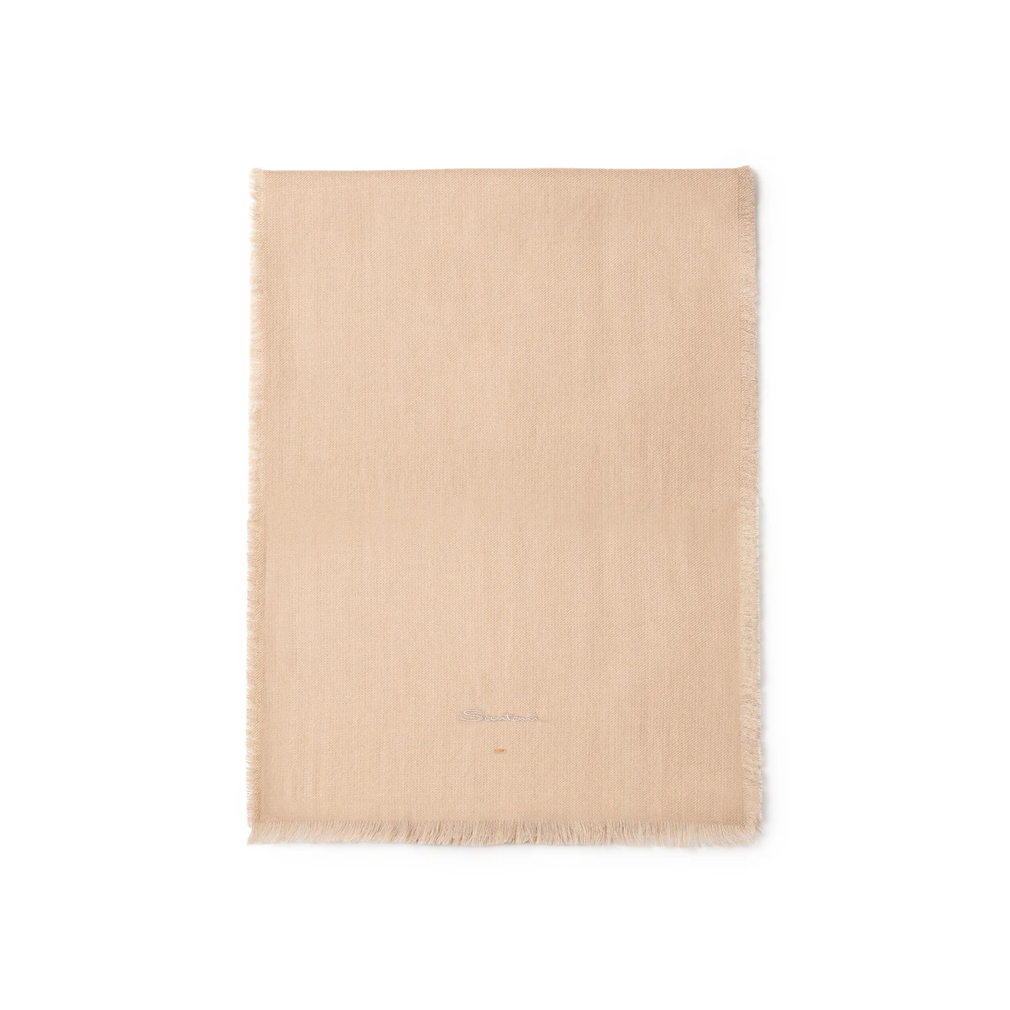 Soft and refined to the touch, this Santoni scarf adds sophistication to tailored outerwear and versatility to casual looks. The women’s style is crafted in Italy from pure combed cashmere: lightweight, finely spun and woven for exceptional quality. It features a double-sided design with two contrasting tones that offers endless styling options. Short fringes on the ends accentuate its graphic character, while the hand-sewn Sigillo topstitching in Arancio Santoni is the Maison’s unmistakable signature. Product details Product ID: AWFLC0034XXXDHEE15 - Crafted from cashmere - Double-sided design - Color: camel and beige - Embroidered Santoni logo - Hand-sewn signature Sigillo topstitching in Arancio Santoni thread - Finished with fringe trims on the short sides - Dimensions: 35 cm x 196 cm - Made in Italy