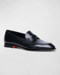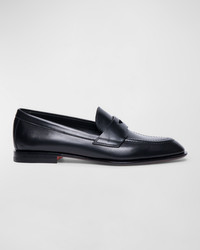 - Santoni "Famed" leather penny loafers - Flat heel - Round apron toe - Notched vamp with keeper strap - Slip-on style - Leather outsole - Made in Italy