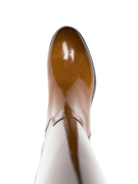 patent leather knee-high boots Taking inspiration from horse riding boots, this pair from Santoni's AW23 collection are finished with a patent effect. The typical cognac-brown hue is accentuated with gradient spots - notice the darker shade on the almond toe. Highlights - Camel brown - Calf leather - Patent finish - Applique logo to the side - Almond toe - Side zip fastening - Low stacked heel - Leather sole - Knee-high - Gold-tone hardware - This piece comes complete with a protective dust bag. Made in Italy Composition Calf Leather 100% Sole: Rubber 60%, Calf Leather 40% Outer: Calf Leather 100% SIZE & FIT Measurement CIRCUMFERENCE 15.35 in(39 cm) HEEL 1.37 in(3.5 cm) HEIGHT 17.32 in(44 cm) Sole height 0.39 in(1 cm)