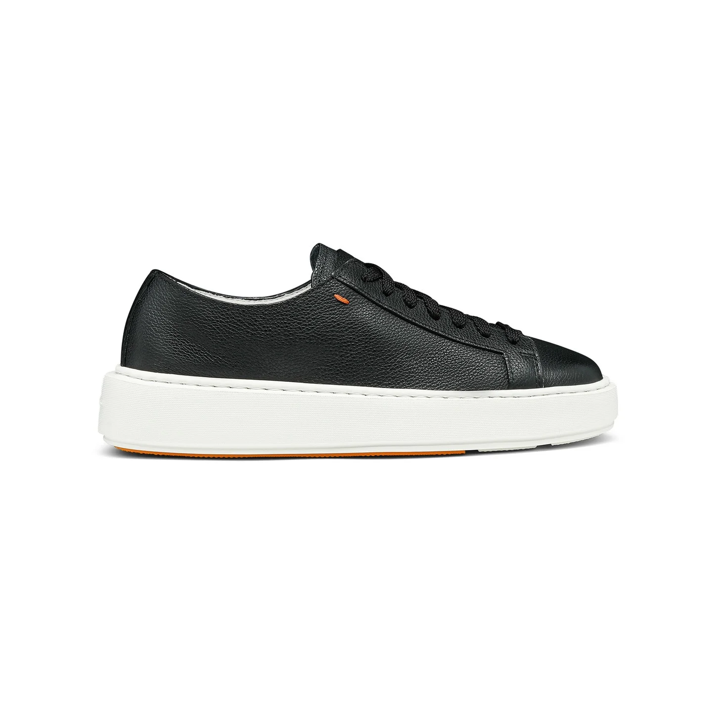 A casual classic, reinterpreted by Santoni to bring artisanal finesse to off-duty looks. Crafted from tumbled leather, this sneaker boasts a clean, compact design that pairs effortlessly with endless ensembles. Branded with a logo print on the tongue and a statement orange detail on the tread to reveal a flash of our signature Santoni Arancio with each stride. A flexible rubber cupsole completes the design for impeccable comfort from morning to night. Product details Product ID: WBCD61322BARCDYIN01 - Crafted from tumbled leather - Color: black - Round toe - Lace-up fastening - Rubber cupsole - Arancio Santoni orange double-buckle detail on the tread - Made in Le Marche, Italy