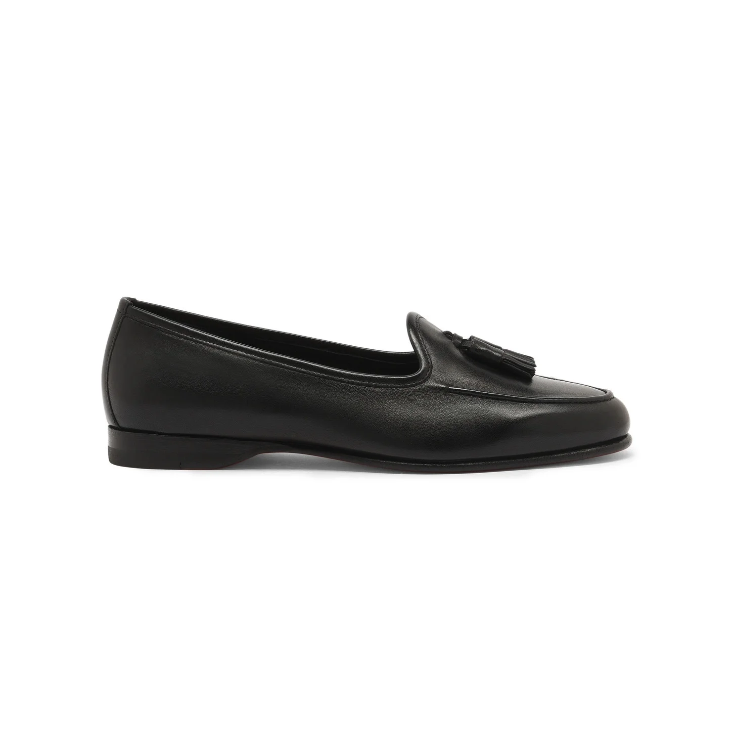 The women’s Andrea loafer reinterprets an archival classic with refined allure, flaunting a sleek, low-cut silhouette that shows off the ankle. This iteration is crafted from nappa leather with our signature “velatura” gradated finish, and is embellished with delicate tassels on the toe. Designed with a special Goodyear welt construction for an ultra-soft, flexible feel. Product details Product ID: WUAN71049PA1TZZFN01 - Women's loafer - Crafted from nappa leather - Treated with Santoni’s “velatura” color-grading technique - Color: black - Tassels - Stitched apron - Classic silhouette with tapered toe - Flexible Goodyear welt construction - Leather sole with rubber insert and half-heel - Printed Santoni logo on the insole - Made in Italy