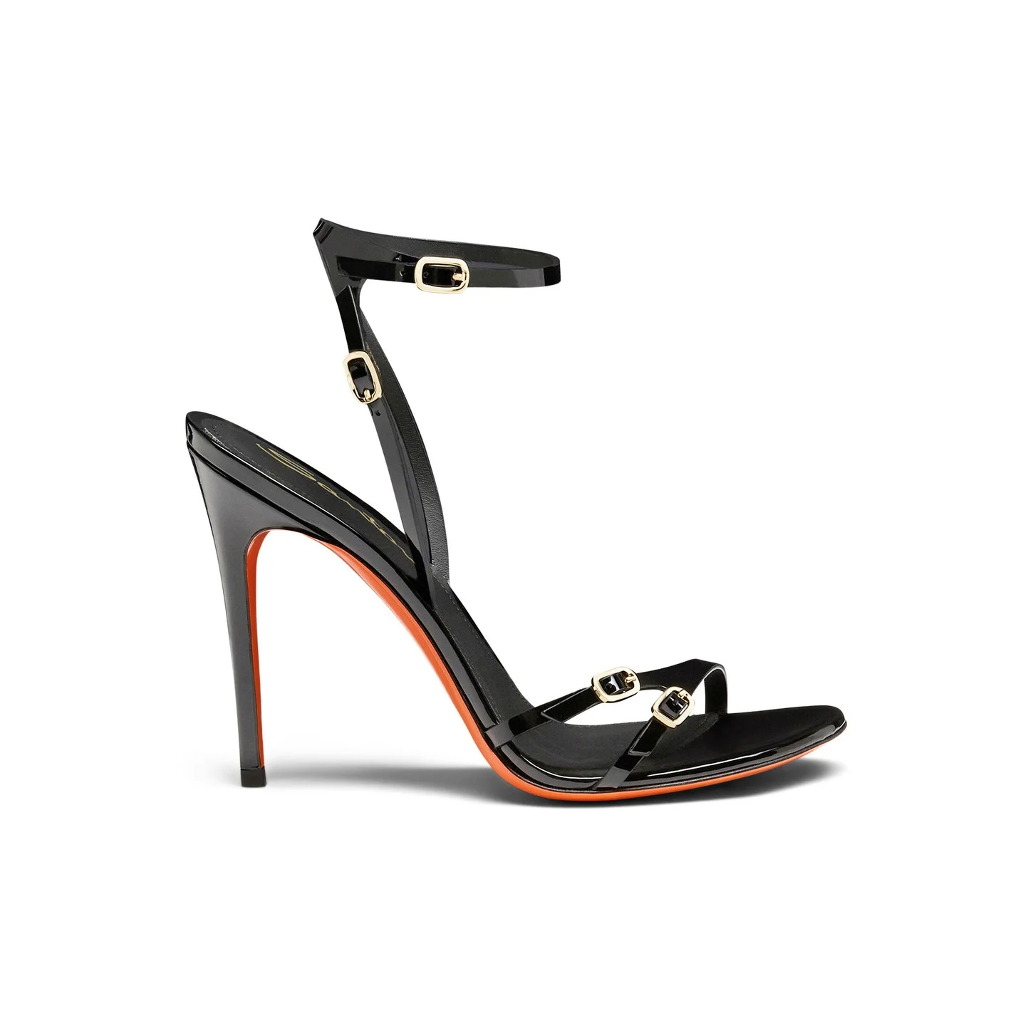 This sandal represents the purest form of feminine elegance. Crafted from shiny patent leather, it’s characterised by a sophisticated interplay of criss-cross straps that recall the iconic lines of our hallmark double buckle. Styled with a stiletto heel and a contrast leather sole in signature Arancio Santoni. Product details Product ID: WHLL71379HA2NVHDN01 - Crafted from patent leather - Color: black - Almond-shaped toe - Double-buckle-inspired strap closure - Leather sole - 10.5 cm stiletto heel - Printed Santoni logo on the insole - Made in Le Marche, Italy