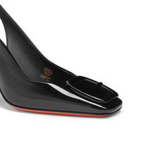 The very essence of feminine attitude, expressed through Santoni's signature aesthetic codes. This shoe recounts the brand’s unique universe with an iconic double-buckle detail and a sculptural silhouette with square toe and trapeze heel. Crafted from shiny patent leather, this elegant style is elevated with an elasticated slingback strap. Product details Product ID: WDMP70407HA2TVHDN01 - Women’s slingback - Crafted from patent leather - Colour: black - Square toe - Enamelled buckle-shaped detail - Strap with elasticated insert - 8.5 cm block heel - Leather sole - Printed Santoni logo on the insole - Made in Italy