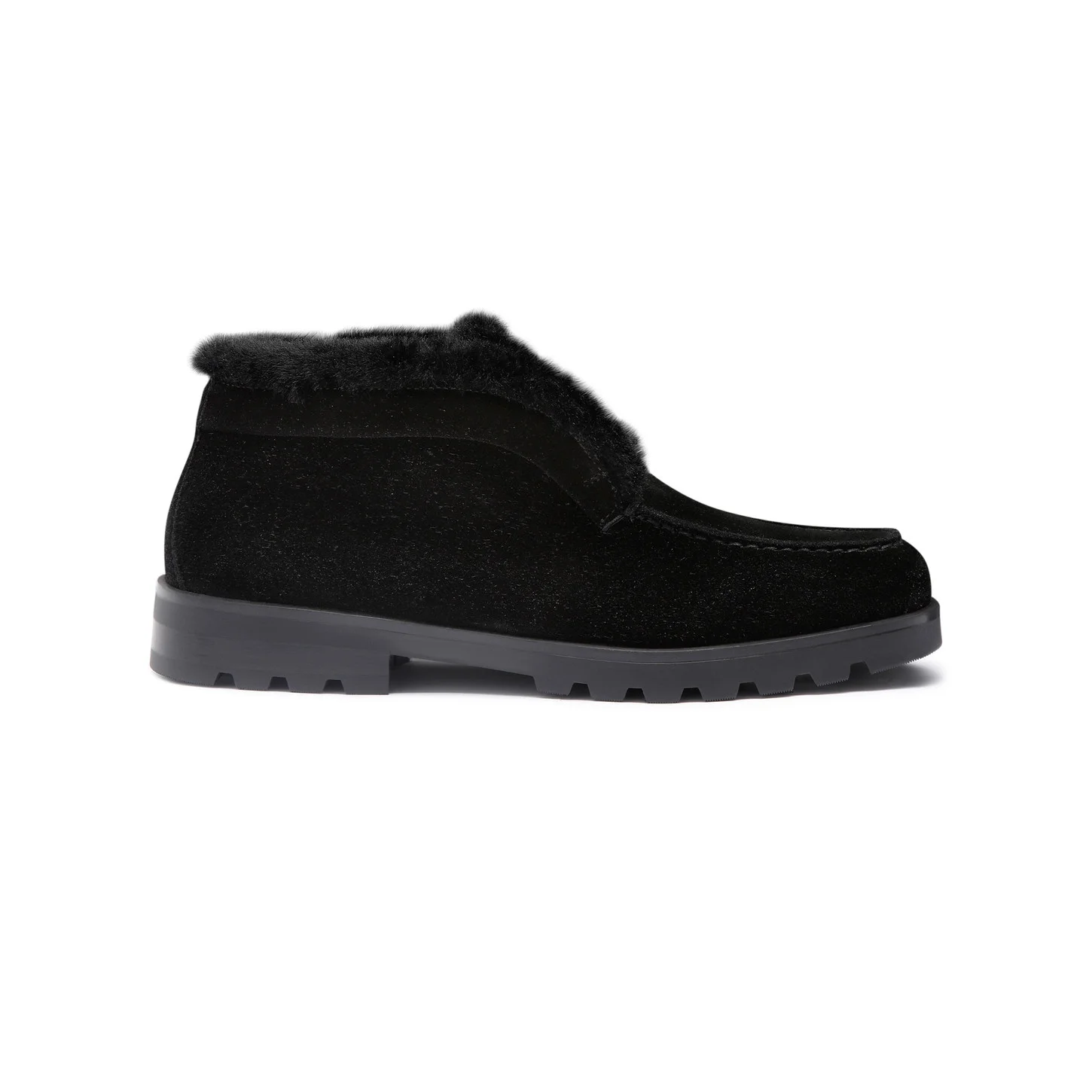 A leisurewear icon, given a new lease of life with the artisanal luxury of Santoni. This women’s desert boot is crafted from elegantly textured suede, lined and edged with fur to ensure an opulent feel during the colder months. Its lightweight construction is elevated with a chunky rubber sole for a modern touch. Product details Product ID: WUDR58457SMRAPFRN01 - Women's desert boot - Crafted from suede - Color: black - Raised apron stitching - Lamb fur edges and lining - Lightly tapered toe - Rubber lug sole - Printed Santoni logo on the insole - Made in Italy