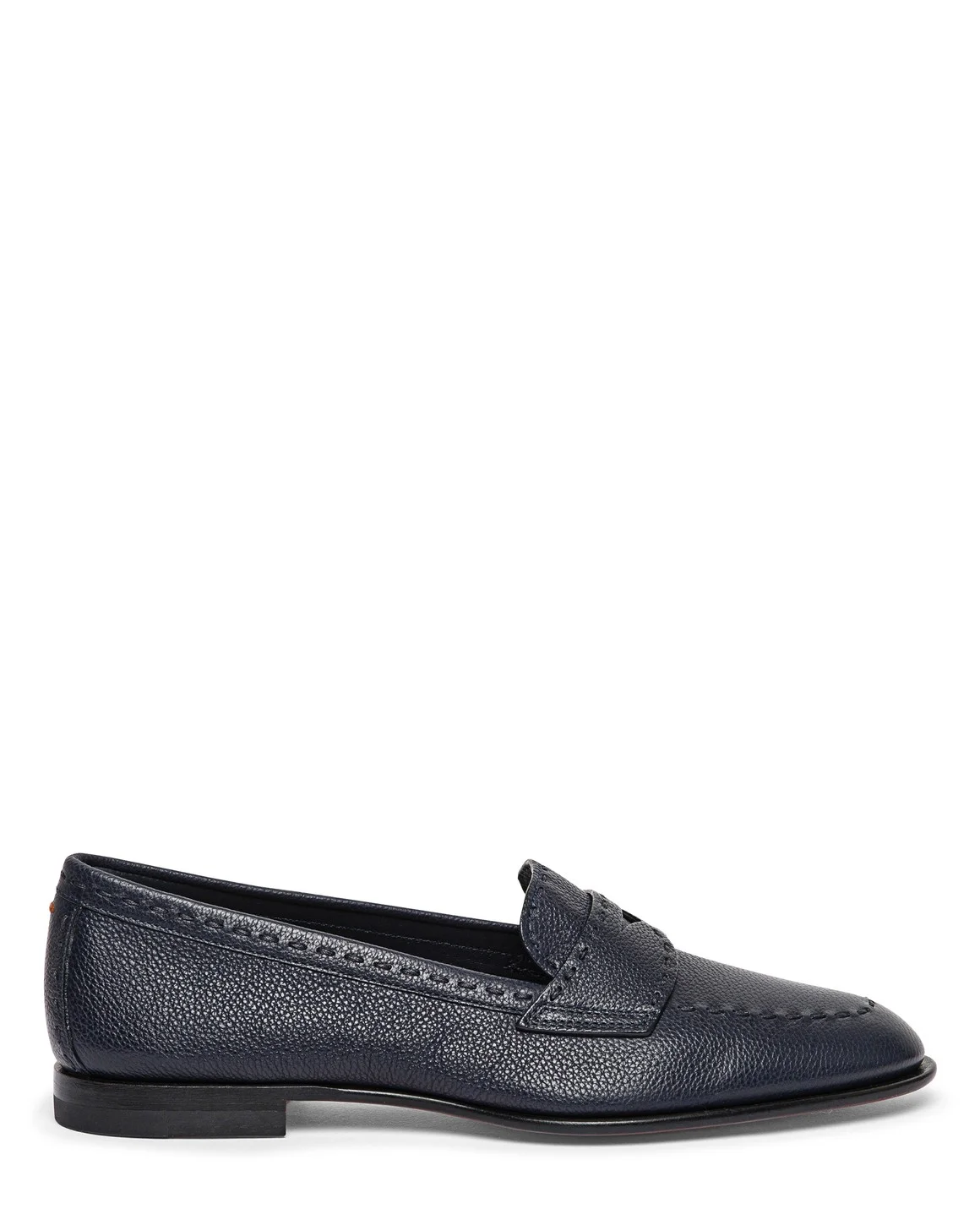 The iconic lines of the penny loafer are rewritten to marry exceptional craftsmanship with modern comfort. Enriched with sophisticated Sigillo stitching along the edges, this Santoni creation is crafted from Granato leather, naturally treated to give the surface its distinctive domed grain. Styled with a sophisticated tapered toe for a versatile look that takes you seamlessly from desk to drinks. Product details Product ID: WUSF71437HAFSWKAU62 - Crafted from Granato leather - Color: Adriatico Blue - Classic saddle strap - Apron stitching - Sigillo stitching along the edges and toe - Arancio Santoni Sigillo stitch - Classic silhouette with tapered toe - Leather sole with half rubber heel - Printed Santoni logo on the insole - Made in Italy