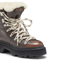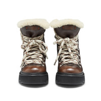 The quintessential hiking boot is enriched with fine materials and artisanal artistry. This fine leather style showcases our signature “velatura” finish, resulting in nuanced hues that fade from one to the next to bring out the harmoniously balanced lines of the silhouette. A fur lining ensures optimal warmth on the coldest of days, while a rubber platform sole draws the eye upwards to elongate the leg. Product details Product ID: WTCW71823NERAYOEC70 - Crafted from leather - Treated with Santoni’s “velatura” color-grading technique - Color: brown - Hiking-style laces - Hiking-inspired loops - Fur lining and collar - Chunky rubber platform sole - Printed Santoni logo on the insole - Made in Le Marche, Italy