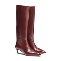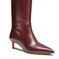 This women’s boot elevates endless looks with pure beauty and artisanal mastery. Nappa leather with a hand-applied nuanced finish traces the lines of its sophisticated silhouette, featuring a tapered toe and wide tubular shaft that slims and lengthens the leg. Styled with a mid-height stiletto heel: an extraordinary masterpiece of modern wearability. Product details Product ID: WSLQ71756HI2NHPER84 - Crafted from nappa leather - Treated with Santoni’s “velatura” color-grading technique - Color: burgundy - Tapered toe - Wide tubular shaft - Inner side zip - 4.5 cm stiletto heel - Leather sole with rubber insert - Printed Santoni logo on the insole - Made in Le Marche, Italy