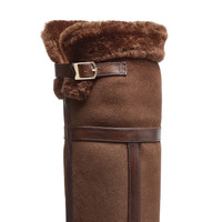 An elegant combination of fine materials, towering heights and a wide shaft that slims and lengthens: this boot is the exclusive essential every woman needs. Crafted from sheepskin with fur on the inside, it showcases the Maison’s traditional coloring technique with hand-treated leather details. A zip on the inner side makes slipping it on and off a breeze, while a strap on the calf with metal buckle detail pays homage to Santoni’s most distinctive style code. Product details Product ID: WSAV71929HI2ARHGM80 - Made from sheepskin - Gradated leather details - Color: dark brown - Tubular sheepskin shaft - Fur lining and trim - Tapered toe - Inner side zip - Adjustable knee-height strap - 9 cm block heel - Leather sole with rubber insert - Printed Santoni logo on the insole - Made in Le Marche, Italy