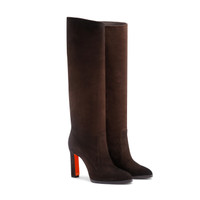 A delicate balance of sleek lines and elegant details: this boot is a refined essential for endless occasions. Crafted from ultra-soft suede, it fits comfortably around the calf with a wide shaft, equipped with a side zip that makes it quick and easy to slip on and off. A high yet sturdy heel, subtle platform and leather sole with rubber insert ensure a comfortable stride from morning to night. Product details Product ID: WSAV71129HI2NAEAT50 - Women's boot - Crafted from suede - Color: dark brown - Classic silhouette with round toe - Wide shaft - Inner side zip - Leather lining - Leather platform sole with rubber insert - 9 cm block heel - Printed Santoni logo on the insole - Made in Italy