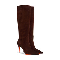 This women’s boot elevates endless looks with pure beauty and artisanal mastery. Crafted from impeccably supple reverse suede, it boasts a refined silhouette with a tapered toe and wide tubular shaft that slims and lengthens the leg. Styled with a delicate stiletto heel: an extraordinary masterpiece of modern wearability. Product details Product ID: WSID71836HI2SAEAS26 - Crafted from suede - Color: dark brown - Tapered toe - Wide tubular shaft - Inner side zip - 8.5 cm stiletto heel - Leather sole with rubber insert - Printed Santoni logo on the insole - Made in Le Marche, Italy