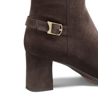 Refined on the eye and versatile at heart, this ankle boot brings Santoni’s artisanal finesse to the everyday. Crafted from exceptionally soft and supple suede, its silhouette is sleek yet easy to wear, featuring a tapered toe and a robust block heel. A decorative strap on the back recalls the Maison’s signature double buckle, lifted from our formal edit and transformed into an emblem of glamorous style. Product details Product ID: WTEZ71846PC4NMGST50 - Crafted from suede - Color: dark brown - Back decorative buckle - Tapered toe - Inner side zip - 6.5 cm block heel - Rubber sole with double buckle pattern - Printed Santoni logo on the insole - Made in Le Marche, Italy