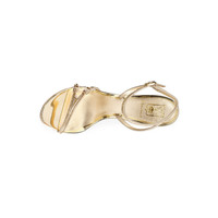 A symphony of luminous reflections that accompany every step with grace and character. Expressing the purest form of feminine elegance, this sandal is constructed using Santoni’s prestigious Serpentine technique: thin strips of metallic leather are manually laid side by side to trace the outline of its graceful silhouette, encrusted with glistening crystals. A sophisticated interplay of intersecting straps nods to the iconic lines of our double buckle, while a stiletto heel draws the upwards to elongate the leg. Product details Product ID: WHLL71986UT2TKOAO35 - Crafted from metallic nappa leather - Thin cord design - Color: Oro Meraviglia - Serpentine workmanship - Crystal embellishments - Almond-shaped toe - Double-buckle-inspired strap closure - Leather sole - 10.5 cm stiletto heel - Santoni Culture embossed crest on the insole - Made in Le Marche, Italy