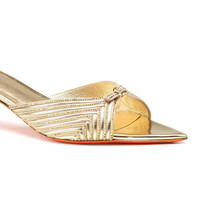 Feminine lines, multi-faceted reflections and refined artisanal workmanship: this mule sandal transforms every step into a statement of elegance. Thin strips of metallic leather are manually laid side by side to trace the outline of its graceful silhouette, encrusted with glistening crystals. Styled with a tapered toe, stiletto heel and geometric strap detailed with a small buckle at the centre that nods to Santoni’s most iconic style code. Product details Product ID: WHTQ71987UT2TKOAO35 - Crafted from metallic nappa leather - Thin cord design - Color: Oro Meraviglia - Serpentine workmanship - Crystal embellishments - Tapered toe - Decorative buckle detail - 4.5 cm stiletto heel - Leather sole - Santoni Culture embossed crest on the insole - Made in Le Marche, Italy