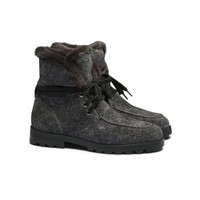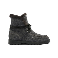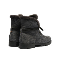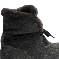 Mountain air meets luxurious allure and artisanal details. This refined take on the classic hiking boot is crafted from suede and lined in cosy fur, providing maximum warmth during the colder months. Functional yet feminine, its silhouette combines timeless apron stitching with a robust rubber sole. Product details Product ID: WTDR71048SMRAHFRG90 - Women’s ankle boot - Crafted from suede - Color: grey - Classic silhouette with round toe - Apron stitching - Lace-up fastening - Pull tab - Fur lining - Rubber lug sole - Printed Santoni logo on the insole - Made in Italy