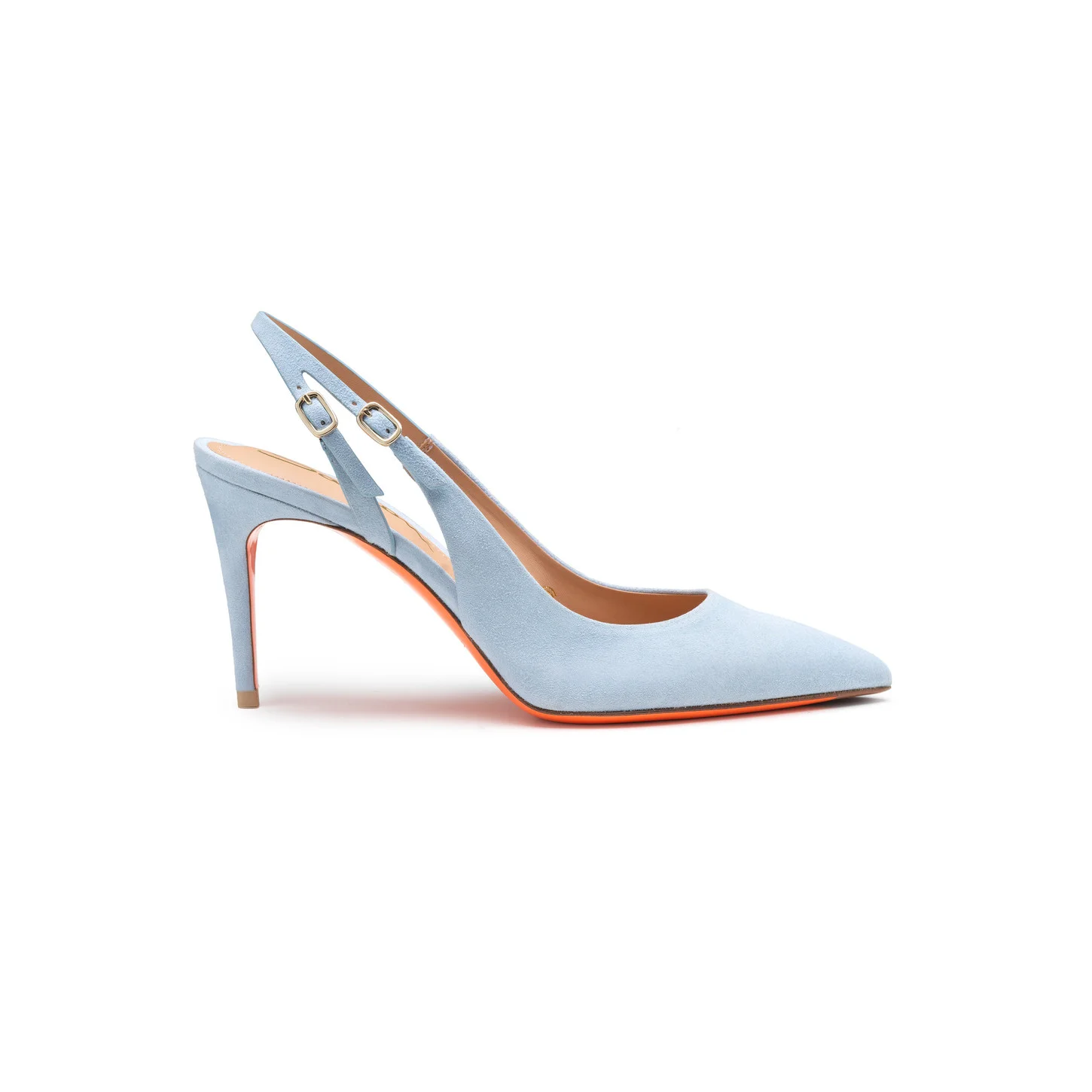 Soft suede leather, harmonious proportions and iconic details: this slingback brings the refined allure of Santoni craftsmanship to the everyday. Its elegant silhouette features a tapered toe and a strap wrapping around the back of the foot, inspired by the iconic lines of our signature double buckle. A stiletto heel elongates the leg, while an Arancio Santoni sole exudes the radiant allure of our hallmark orange hue. Product details Product ID: WDID71269HI2NMGDZ52 - Crafted from suede - Color: light blue - Classic silhouette with tapered toe - Double buckle-inspired strap closure - Leather sole with rubber insert - 8.5 cm high heel - Printed Santoni logo on the insole - Made in Le Marche, Italy