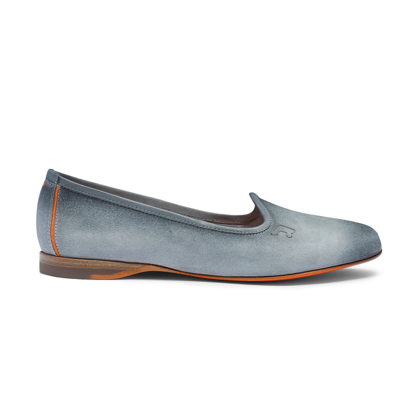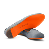 Elevate your everyday wardrobe with this suede loafer, adding a refined update to office-to-evening looks. Its sleek silhouette is accentuated with refined leather trims, featuring a contrast orange sole to mark every stride with signature Santoni allure. Designed with a Goodyear welt construction for a soft, flexible feel. Product details Product ID: WUAY71013SA5SAEAG10 - Women’s loafer - Crafted from suede - Colour: light blue - Tonal leather trims - Classic tapered silhouette - Goodyear welt construction - Leather sole with half rubber heel - Printed Santoni logo on the insole - Made in Italy