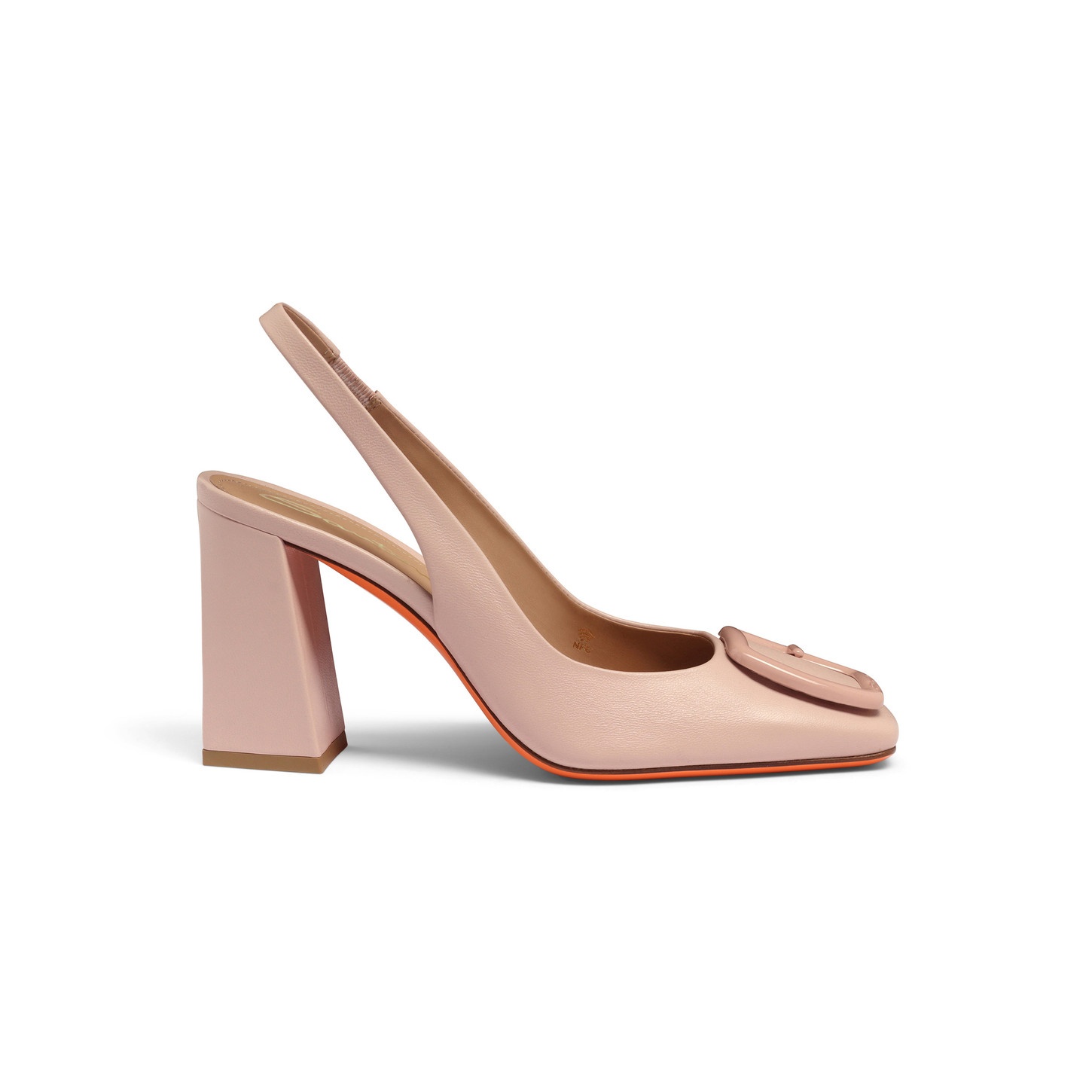 Exquisite craftsmanship, iconic details and glamorous allure define this fine nappa leather slingback. Its sleek silhouette is defined by a square toe and a comfortable block heel. Enriched with a distinctive detail that recalls Santoni’s iconic double buckle, lifted from our formal footwear edit and transformed into an emblem of modern style. Product details Product ID: WDMP70407HA2NSZAP20 - Crafted from nappa leather - Color: pink - Square toe - Buckle-shaped detail - Strap with elasticated insert - 8.5 cm block heel - Leather sole - Printed Santoni logo on the insole - Made in Le Marche, Italy