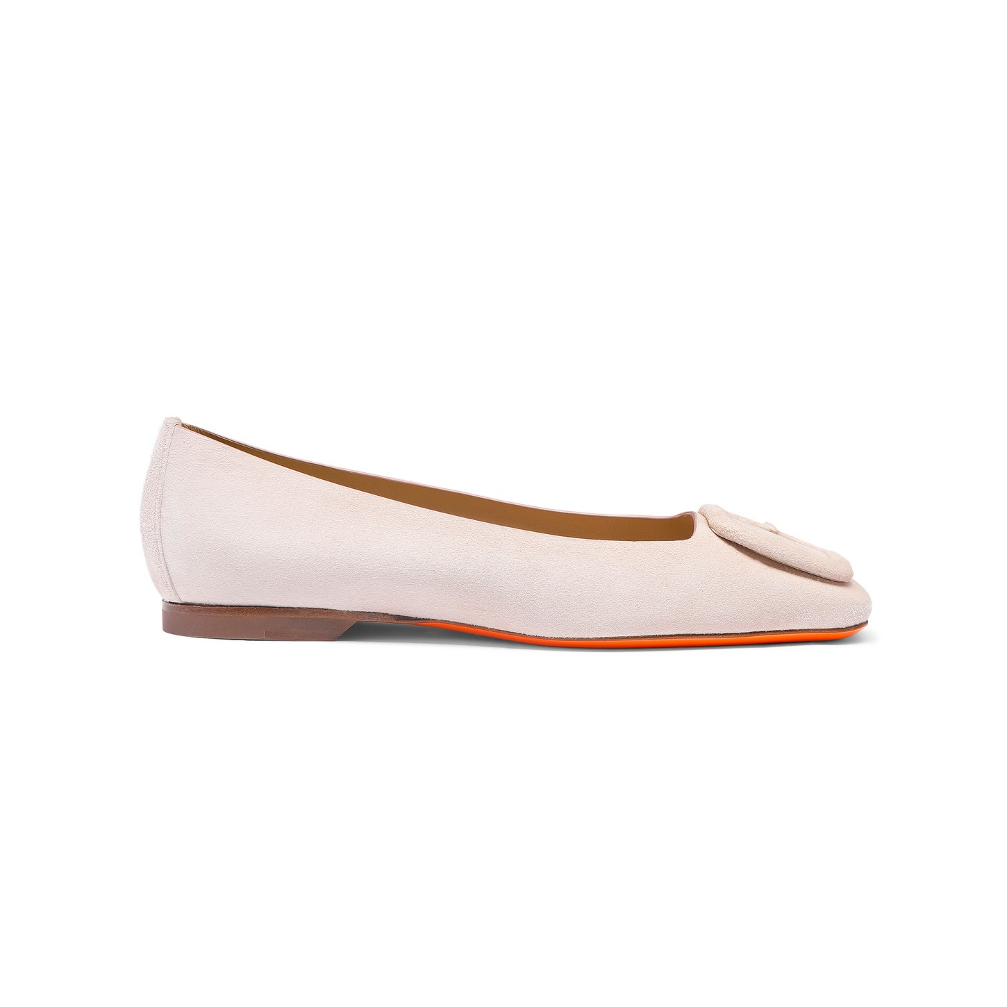 This suede leather ballet pump rewrites the women's wardrobe staple with balanced proportions and meticulous attention to detail. Its chic square-toe silhouette is adorned with a distinctive embellishment that pays homage to Santoni's iconic double-buckle shoe. Finished with a contrast leather sole in celebration of our signature orange tone. Product details Product ID: WAMA71150HI1TMGDP15 - Women's ballet flat - Crafted from suede - Color: pink - Low-cut silhouette - Classic silhouette with square toe - Double-buckle detail on the toe - Leather sole with rubber insert and half-heel - Printed Santoni logo on the insole - Made in Italy