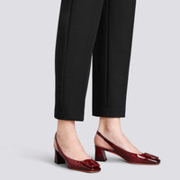Chic lines, iconic details and a glossy patent leather construction: embrace Santoni’s glamorous side. This ultra-feminine slingback flaunts a sleek, elegant silhouette with a square toe and easy-to-wear mid-height heel. Embellished with a tonal enamelled detail inspired by our iconic double-buckle shoe. Product details Product ID: WDMN70342HI2TVAAR80 - Women’s slingback - Crafted from patent leather - Color: pink - Square toe - Enamelled buckle-shaped detail - Strap with elasticated insert - 5 cm block heel - Leather sole - Printed Santoni logo on the insole - Made in Italy