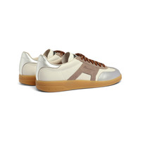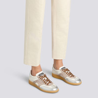 The women's DBS Oly sneaker boasts a lightweight silhouette reminiscent of classic ‘70s tennis shoes. Steeped in Santoni heritage yet radiating contemporary spirit, this style is crafted from leather with metallic inserts for a glamorous touch. Our iconic double-buckle detail is reimagined in suede on the sides, borrowed from our formal footwear edit and transformed into an emblem of modern style. A slim natural-toned sole reinforces its retro allure. Product details Product ID: WBPL61244FARSPSXG40 - Crafted from leather and suede - Color: beige and silver - Double-buckle-inspired suede side detail - Lace-up fastening - Natural rubber cupsole - Santoni lettering moulded into the tread - Made in Le Marche, Italy