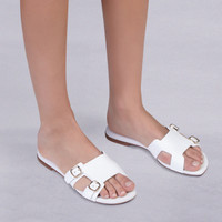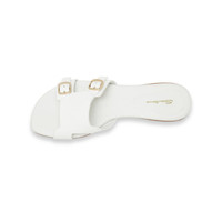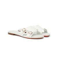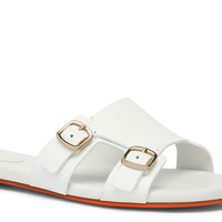 Whether you choose to pair it with a maxi dress or jeans, this women's sandal adds a chic touch to any look. Its refined leather construction is treated using Santoni's age-old distressing technique, enhanced with a wide band with double-buckle fastening. Product details Product ID: WHPF70071HA1TLGAI50 - Women's sandal - Crafted from leather - Colour: White - Double-buckle decoration - Square toe - Leather sole with half rubber heel - Printed Santoni logo on the insole - Made in Italy