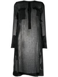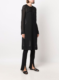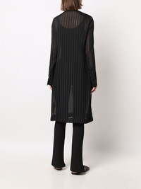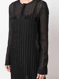 striped sheer oversized T-shirt jet-black vertical stripe pattern sheer crew neck long sleeves Made in Italy Composition Polyester 100% SIZE & FIT Model measurements Height 5 ft 10 in(1.78 m) Bust/Chest 33.46 in(85 cm) Hips 36.22 in(92 cm) Waist 23.22 in(59 cm) FittingInformation This piece fits true to size. We recommend you get your regular size Cut for a loose fit Made with a mid-weight non-stretch fabric