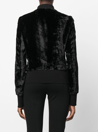 velvet bomber jacket black velvet effect ribbed band collar front zip fastening front zip fastening pockets long sleeves ribbed cuffs ribbed hem Made in Italy Composition Outer: Polyester 100%, Viscose 86%, Polyamide 12%, Spandex/Elastane 2% Lining: Cupro 100% SIZE & FIT Model measurements Height 5 ft 9 in(1.76 m) Bust/Chest 33.07 in(84 cm) Hips 38.58 in(98 cm) Waist 24.8 in(63 cm) FittingInformation This piece fits true to size. We recommend you get your regular size Cut for a slim fit Made with a mid-weight fabric