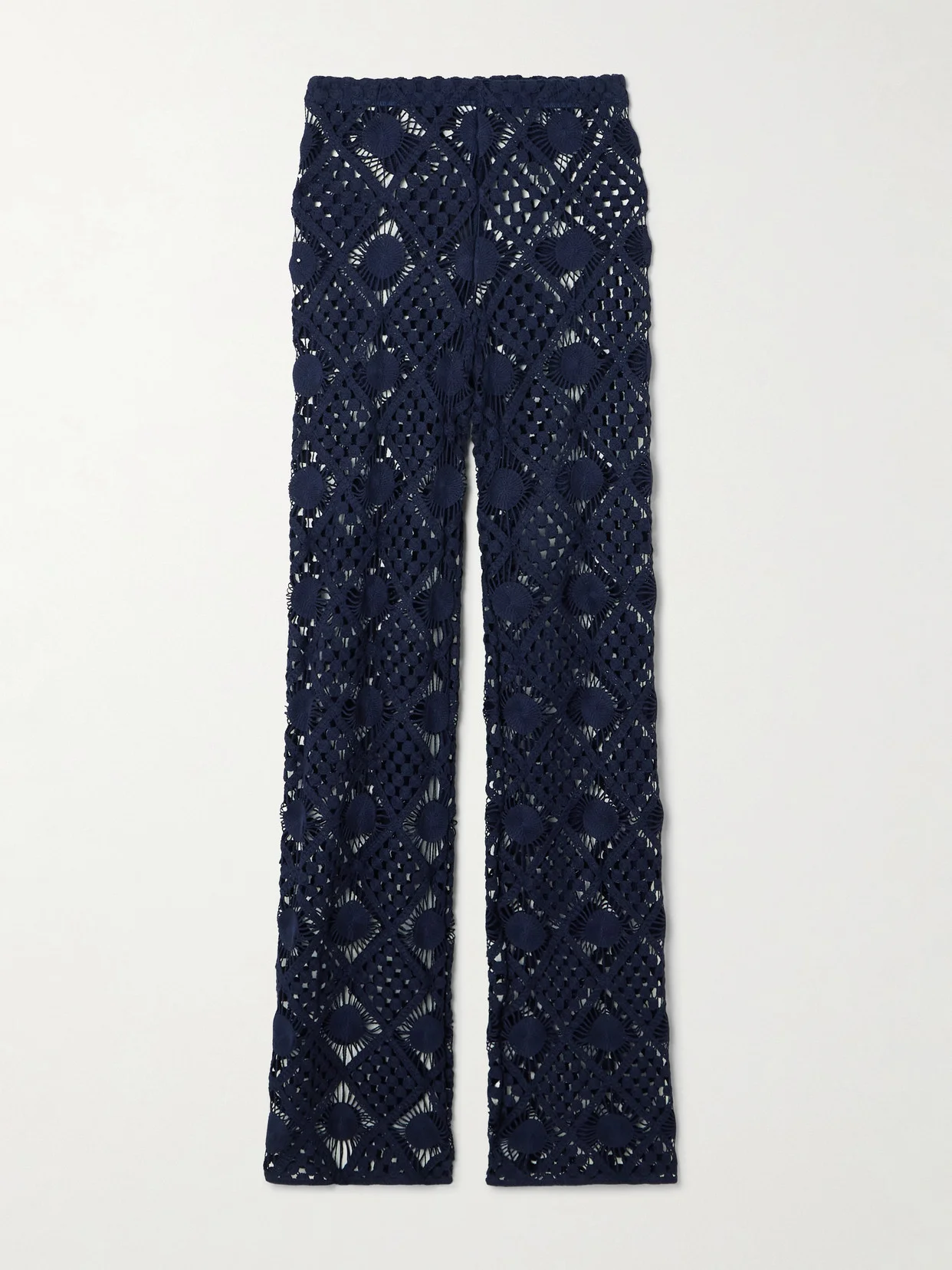 Sara Cristina's 'Playa' pants are crocheted from cotton in a pattern that resembles blazing suns. Offered in a versatile navy shade, they're fitted with a comfortable elasticated waistband and have a wide-leg shape. Temper the sheerness with a tonal bikini.