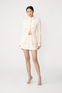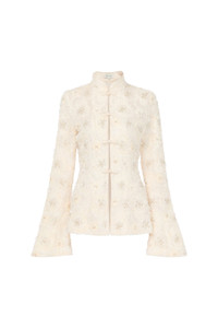 The Aja Top is a tailored design with flared sleeves, featuring a mandarin collar and hand-tied pipa knot buttons for a polished finish. Crafted from a soft, fuzzy fabric and embellished with subtle crystal floral embroidery, it’s perfect for a chic party statement. Complete the look with the matching Aja Skirt. MATERIAL & CARE • Shell - 100% Poly sequins with beads • Lining - 100% Polyester • Garment Care: Hand wash separately or dry clean