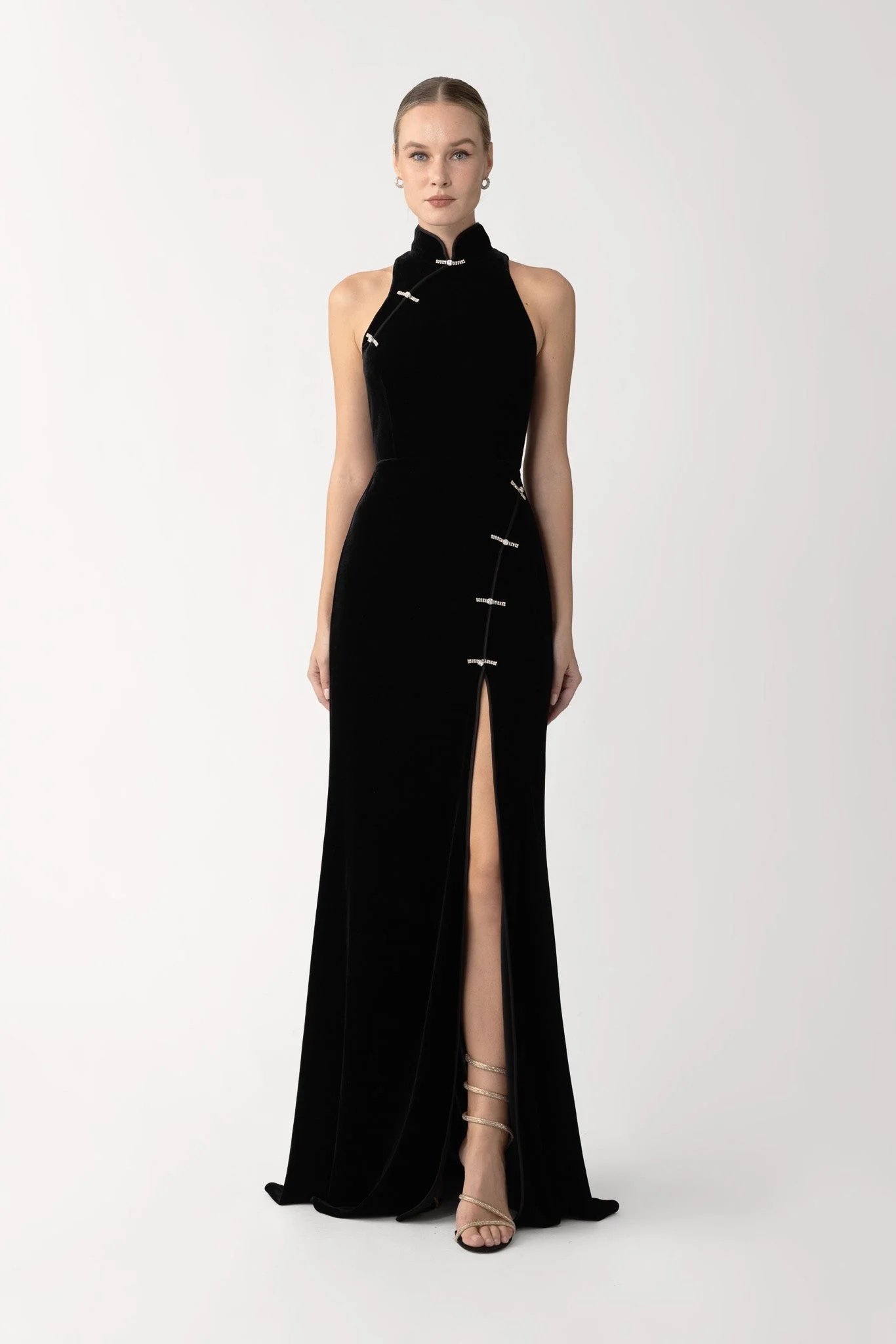 The Ariana Velvet Gown is cut from luxurious velvet in a modern cheongsam silhouette. Featuring a mandarin collar, crystal pankou buttons, and a thigh-high slit, it’s a bold expression of evening glamour. SIZE & FIT • Fits true to size, take your normal size • Fully lined • Non-stretch fabric • Length (collar to hem): size 00 to size 0 - 62.2", size 2 to size 4 - 64.6", size 6 to size 8 - 65.0", size 10 to size 12 - 65.4", size 14 - 65.7" • Model's measurements: height 5'10" bust 31.5" waist 23" hips 35" • Model is wearing size 2 MATERIAL & CARE • Shell - 95% Polyester, 5% Spandex • Lining - 97% Polyester, 3% Spandex • Garment Care: Hand wash separately or dry clean