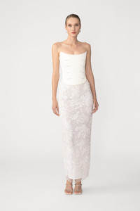 The Arielle Skirt is a high-waisted, fitted silhouette cut in midi length featuring intimate embroidery with sequinned florals. Includes a separate slip for coverage. Make it a complete look when paired with the Della corset top. SIZE & FIT • Fits true to size, take your normal size • Comes with a removable slip • Non-stretch fabric • Length (waist to hem): size 00 to size 0 - 39.8", size 2 to size 14 - 41.7" • Model's measurements: height 5'9" bust 32" waist 25" hips 36" • Model is wearing size 2 MATERIAL & CARE • Shell - 100% Polyester • Lining - 100% Polyester • Garment Care: Hand wash separately or dry clean