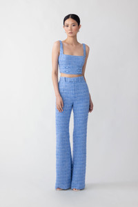 Tweed flared high-waisted pants. Pair with Bridgette Tweed Top SIZE & FIT • Fits true to size, take your normal size • Fully lined • Non-stretch fabric • Length (waist to hem): size 00 - 15.4", size 0 - 15.6", size 2 - 15.7", size 4 - 15.9", size 6 - 16.1", size 8 - 16.3", size 10 - 16.6", size 12 - 16.9", size 14 - 17.2" • Model's measurements: height 5'9" bust 32" waist 25" hips 35" • Model is wearing size 2 MATERIAL & CARE • Shell - 100% Polyester • Lining - 100% Polyester • Garment Care: Hand wash separately or dry clean