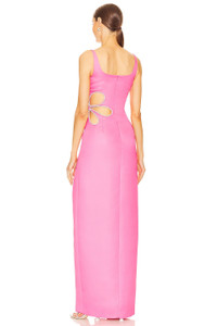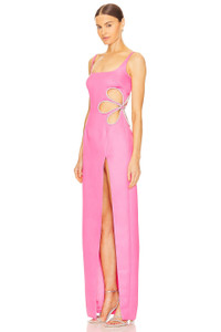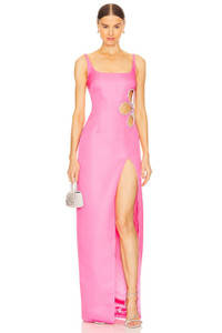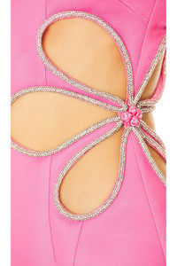 - Shell: 100% polyester Lining: 97% polyester 3% spandex - Made in China - Dry clean recommended - Fully lined - Hidden back zipper closure - Rhinestone embellished floral cut-out and side - Satin fabric with side seam slit - Revolve Style No. SLEE-WD278 - Manufacturer Style No. S24D39