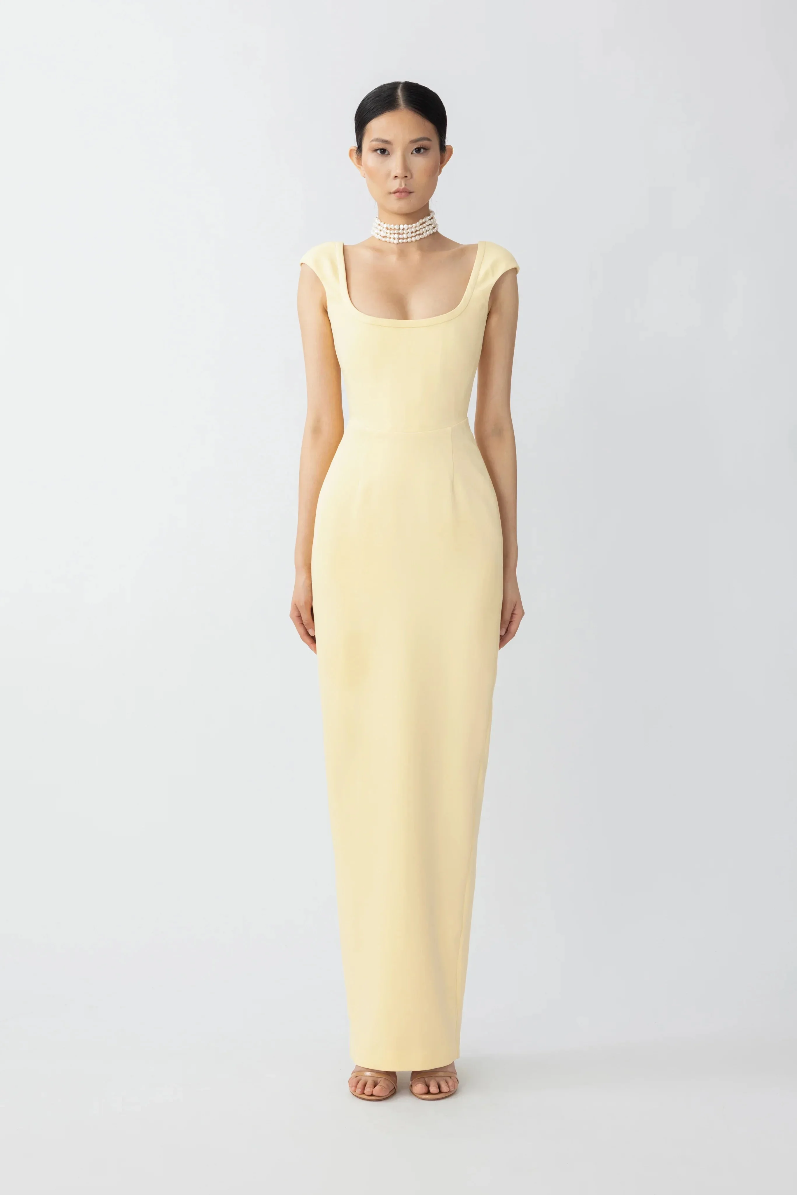 Crepe fitted gown with a scoop neckline and slight cap sleeves SIZE & FIT • Fits true to size, take your normal size • Designed for a closed fit • Fully lined • Fully boned corset top • Non-stretch fabric • Length (shoulder to hem): size 00 to size 0 - 51.4", size 2 to size 14 - 53.3" • Model's measurements: height 5'9" bust 32" waist 25" hips 35" • Model is wearing size 2 MATERIAL & CARE • Shell - 100% Polyester • Lining - 97% Polyester, 3% Spandex • Garment Care: Hand wash separately or dry clean