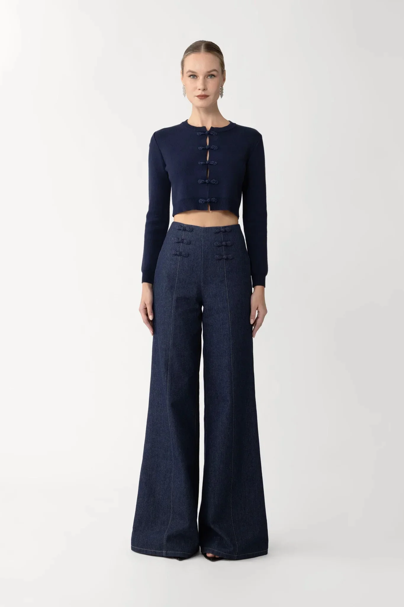 The Brooklyn Pant is a wide-leg denim silhouette featuring hand-tied pipa knots along the front. Its clean cut balances volume with structure. SIZE & FIT • Fits true to size, take your normal size • Fully lined • Length (waist to hem): size 00 to size 0 - 44.3", size 2 to size 14 - 47.4" • Model's measurements: height 5'9" bust 32.5" waist 23.5" hips 35" • Model is wearing size 2 MATERIAL & CARE • Shell - 100% Cotton • Lining - 100% Polyester • Garment Care: Hand wash separately or dry clean