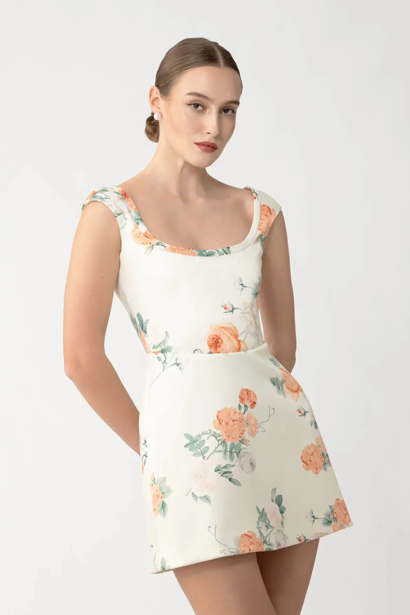A playful mini dress in luxurious satin, the Bryn Dress features a fully boned bodice and an A-line skirt. Printed in an original peach and ivory rose motif for a romantic touch. SIZE & FIT • Fits true to size, take your normal size • Fully lined • Length (shoulder to hem): size 00 to size 0 - 30.3", size 2 - 31.1", size 4 - 31.5", size 6 - 31.9", size 8 - 32.3", size 10 to size 14 - 32.7" • Model's measurements: height 5'10" bust 31.5" waist 23" hips 35" • Model is wearing size 2 MATERIAL & CARE • Shell - 100% Polyester • Lining - 97% Polyester, 3% Spandex • Garment Care: Hand wash separately or dry clean