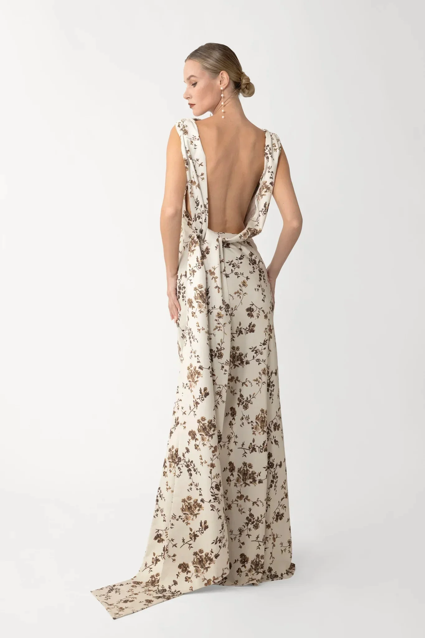 The Callie Gown is a backless statement piece, cut from milky crepe in a cream floral print for a vintage touch. It features hand-sewn dramatic tails that tie and drape elegantly at the back. SIZE & FIT • Fits true to size, take your normal size • Fully lined • Length (collar to hem): size 00 to size 0 - 43.7", size 2 to size 14 - 45.7" • Model's measurements: height 5'9" bust 32.5" waist 23.5" hips 35" • Model is wearing size 2 MATERIAL & CARE • Shell - 100% Polyester • Lining - 97% Polyester, 3% Spandex • Garment Care: Hand wash separately or dry clean