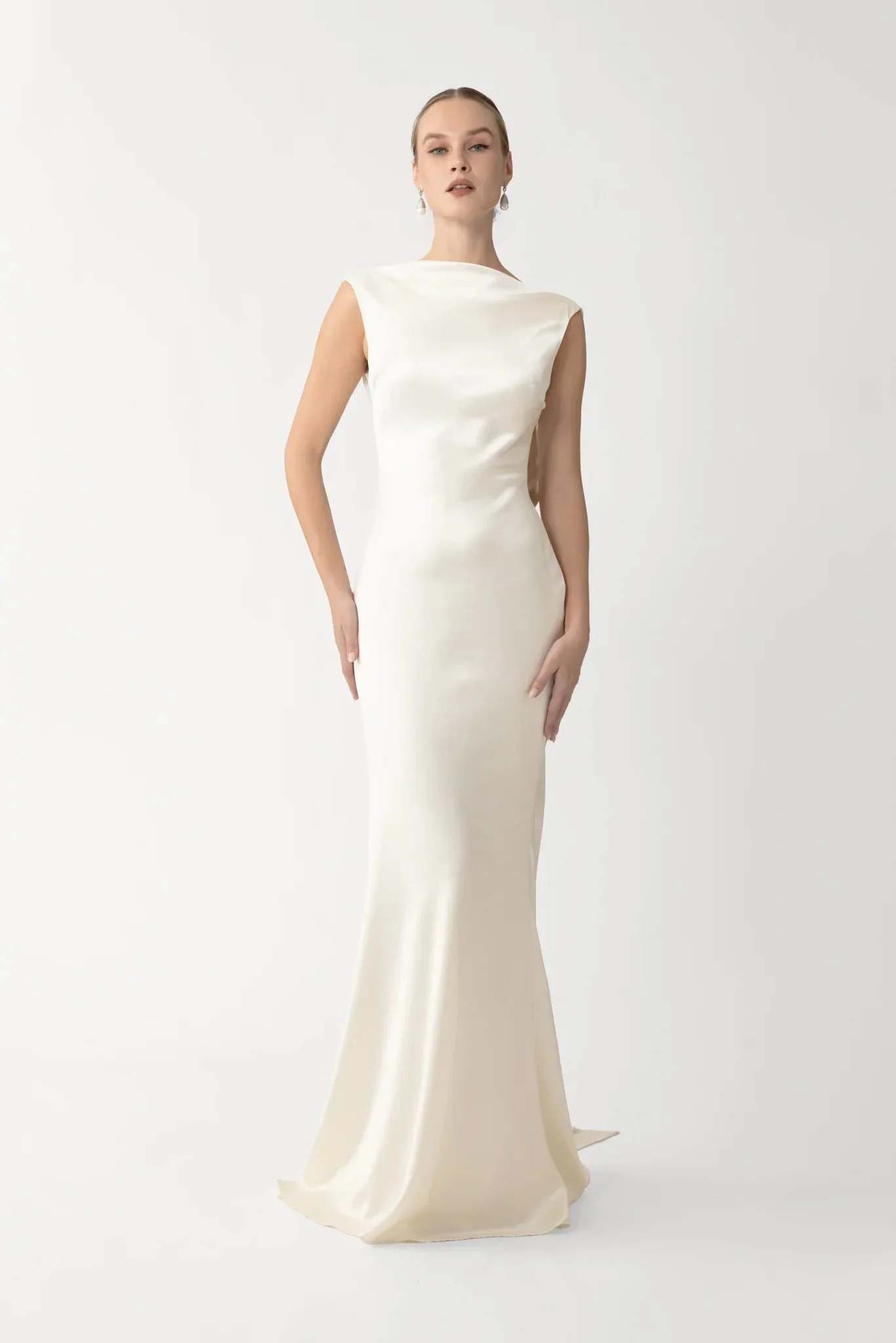 Sculpturally draped, open-back satin gown in a bias-cut fit, featuring extended tails that can be tied at the back to cascade alongside a full train SIZE & FIT • Fits true to size, take your normal size • Length (collar to hem): size 00 to size 0 - 54.3", size 2 to size 14 - 56.3" • Model's measurements: height 5'9" bust 32" waist 25" hips 36" • Model is wearing size 2