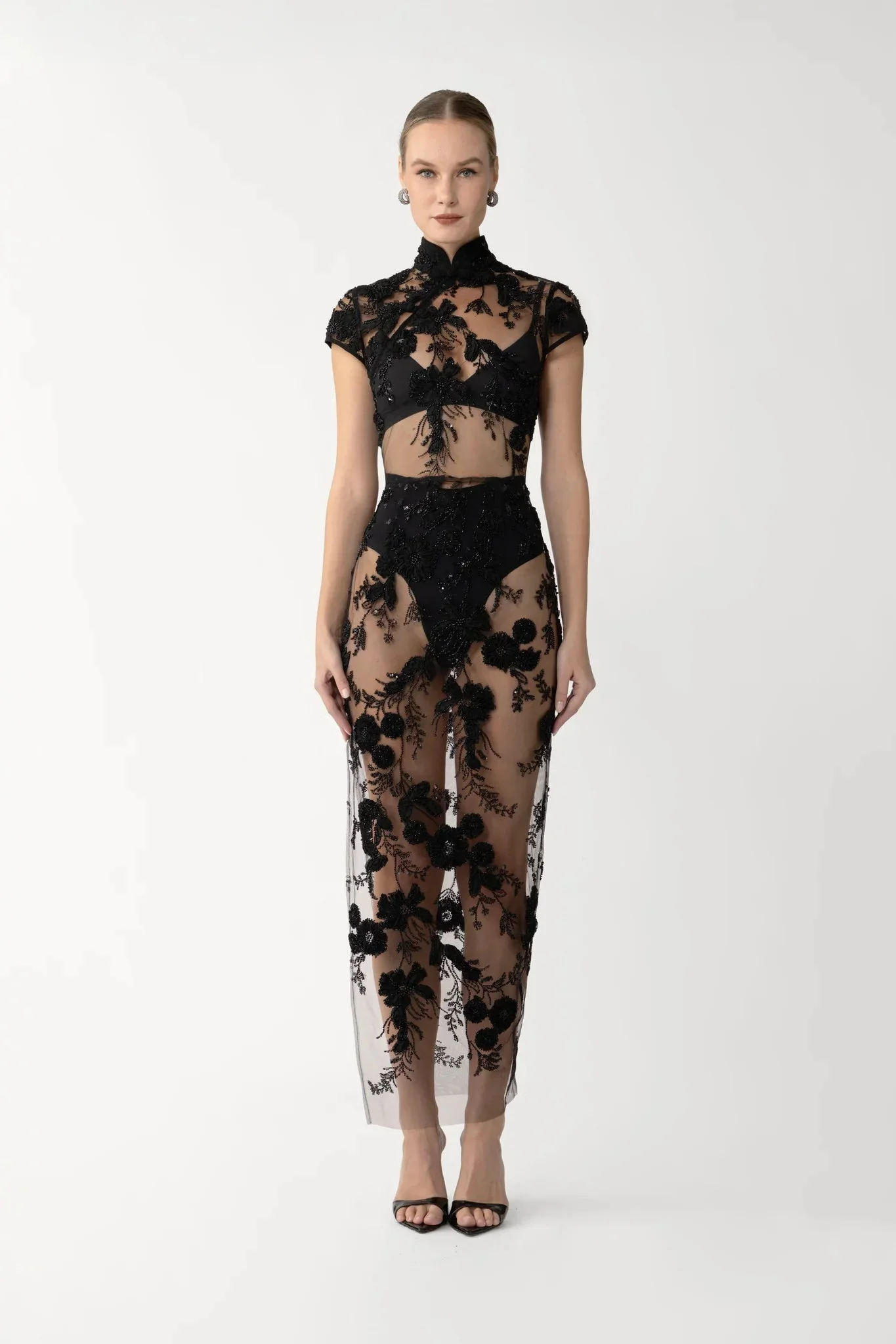 The Charlize Dress is a cheongsam crafted in mesh and adorned with floral sequin beading. Featuring a mandarin collar and hand-tied pipa knots along the neckline, it comes with a separate slip dress. SIZE & FIT • Fits true to size, take your normal size • Comes with removable slip • Non-stretch fabric • Length (collar to hem): size 00 to size 0 - 53.1", size 2 to size 14 - 55.1" • Model's measurements: height 5'9" bust 32.5" waist 23.5" hips 35" • Model is wearing size 2 MATERIAL & CARE • Shell - 100% Polyester • Lining - 100% Polyester • Garment Care: Hand wash separately or dry clean