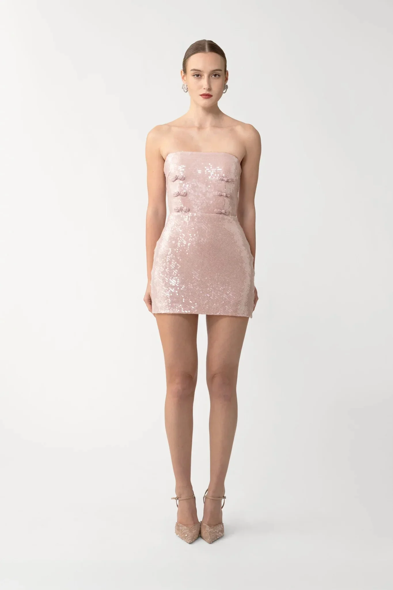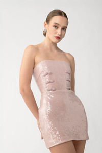 The Cindy Dress is a pretty mini in pink sequins, featuring a fully boned bodice, a softly fitted skirt, and signature hand-tied pipa knot detailing. SIZE & FIT • Fits true to size, take your normal size • Fully lined • Length (bust to hem): size 00 to size 0 - 21.8", size 2 - 22.6", size 4 - 23.0", size 6 - 23.3", size 8 to size 14 - 23.7" • Model's measurements: height 5'10" bust 31.5" waist 23" hips 35" • Model is wearing size 2 MATERIAL & CARE • Shell - 100% Polyester • Lining - 100% Polyester • Garment Care: Hand wash separately or dry clean