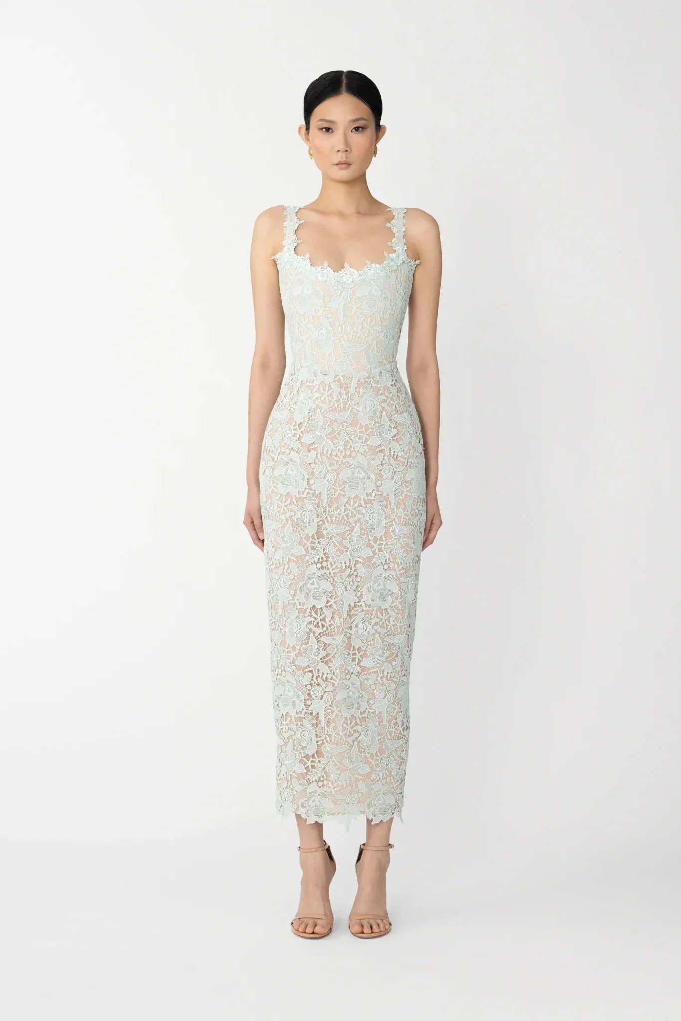 Romantic lace midi dress over nude lining with fully-boned corset bodice featuring scalloped neckline, straps, and hem MATERIAL & CARE • Shell - 100% Polyester • Lining - 100% Polyester • Garment Care: Hand wash separately or dry clean