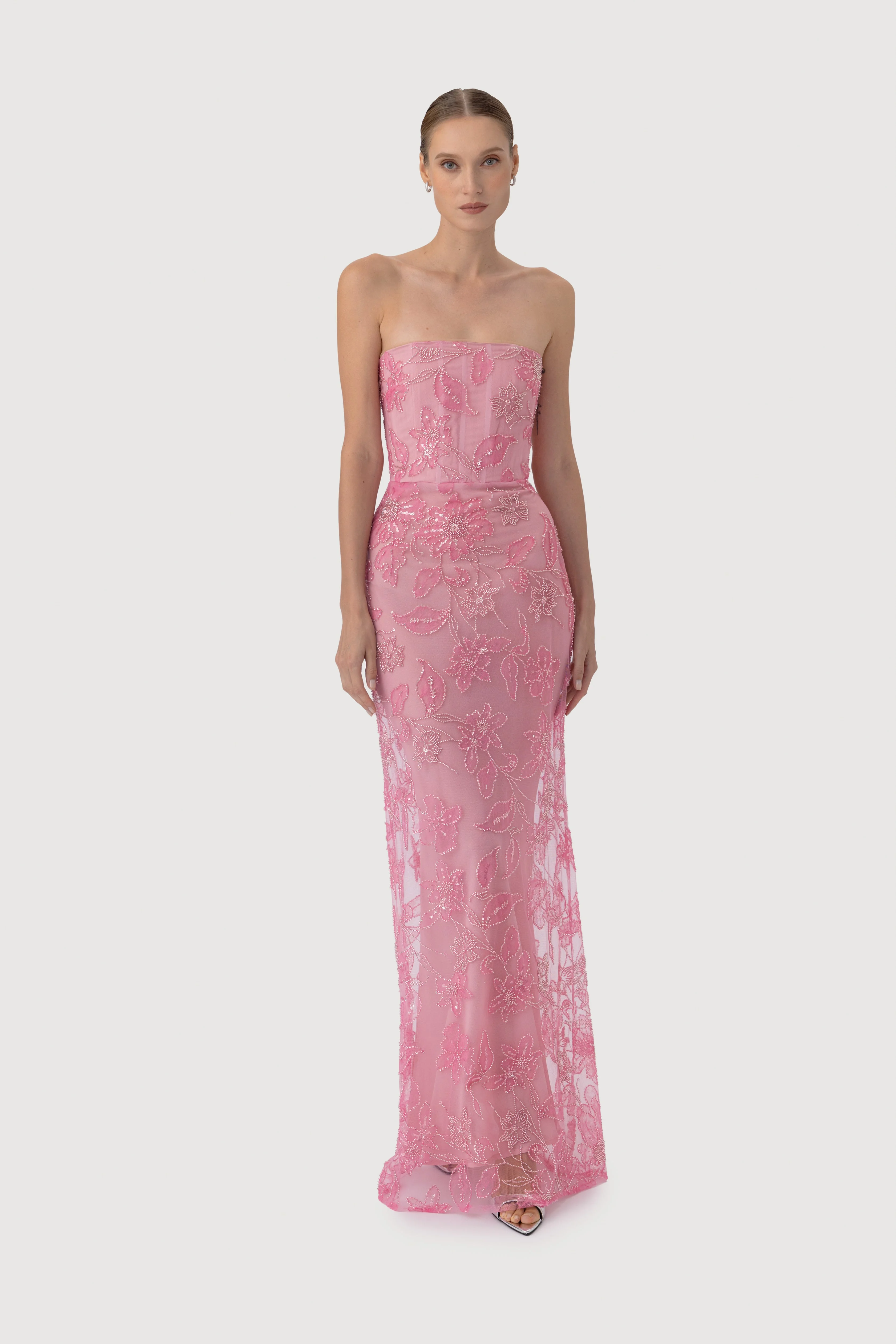 Featuring an elegant strapless outline, the Courtney dress is adorned with delicate floral lace mesh fabric, each petal intricately embellished with sequins and beads. The built-in structured corset bodice sculpts the frame, creating a unique and modern style. SIZE & FIT • Fits true to size, take your normal size • Fully Lined • Non-stretch fabric • Model's measurements: height 5'9" bust 32 waist 25 hips 36 • Model is wearing size 2 MATERIAL & CARE • Shell - 100% Polyester Chiffon • Lining - 100% Polyester Chiffon • Garment Care: Hand wash separately or dry clean