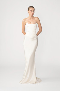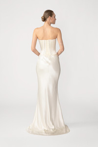 The Della Top is a modern strapless corset designed to sculpt an hourglass silhouette, with a sleek front bodice subtly adorned with signature hand-tied pipa knots. Pair it with the Dolly Skirt in matching glossy satin for timeless, understated romantic allure. SIZE & FIT • Fits true to size, take your normal size • Non-stretch fabric • Length (bust to hem): size 00 - 13.0", size 0 - 13.1", size 2 - 13.2", size 4 - 13.3", size 6 - 13.4", size 8 - 13.5", size 10 - 13.7", size 12 - 13.9", size 14 - 14.1" • Model's measurements: height 5'9" bust 32" waist 25" hips 36" • Model is wearing size 2 MATERIAL & CARE • Shell - 75% Acetate, 25% Polyester • Garment Care: Hand wash separately or dry clean