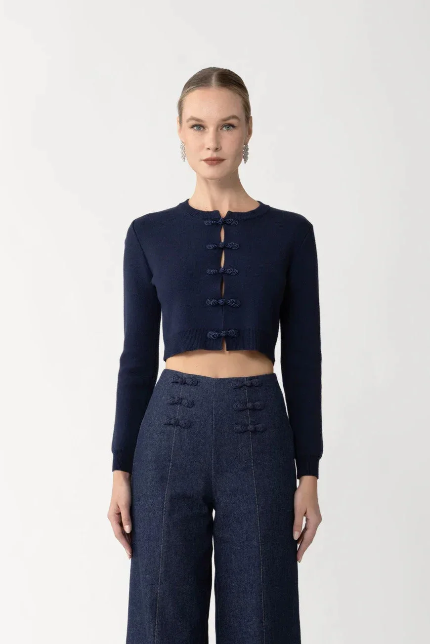The Demi Cardigan is a cropped knit design finished with hand-tied pipa knots along the front. A versatile layer, equally suited to weekday styling and relaxed days. MATERIAL & CARE • Shell - 78% Viscose, 22% Polyester • Garment Care: Hand wash separately or dry clean